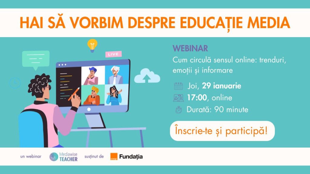 Te invităm la un nou webinar gratuit din seria „Hai să vorbim despre educație media!”, organizat de Mediawise Society prin programul Mediawise Teacher, susținut de Fundația Orange, prin Digitaliada.